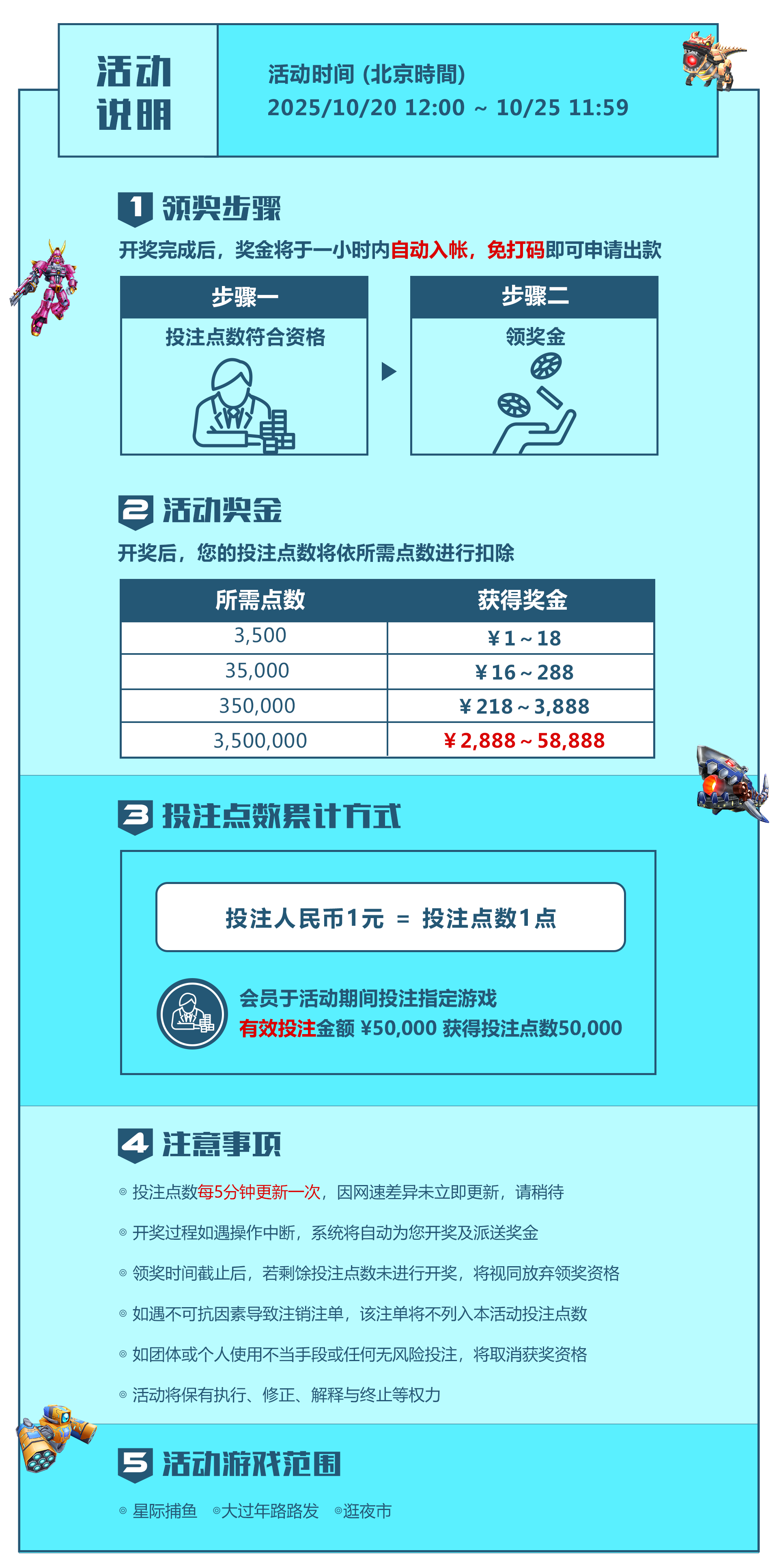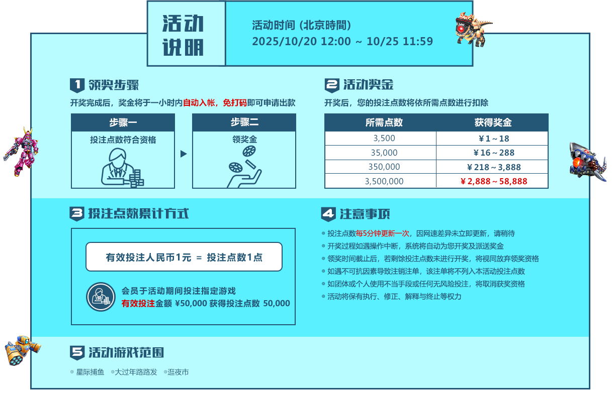 - 活动期间:2025/10/20 12:00 - 10/25 11:59 (北京时间),累积投注点数及领奖时间。