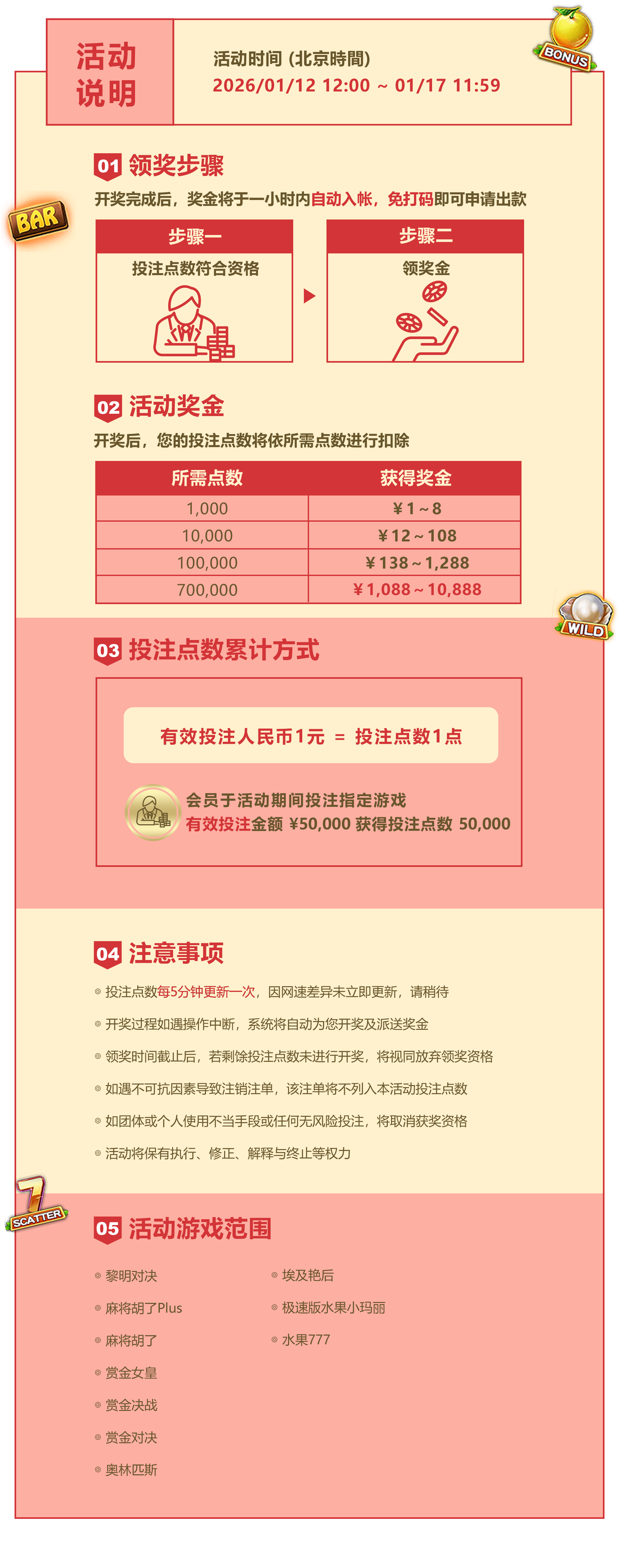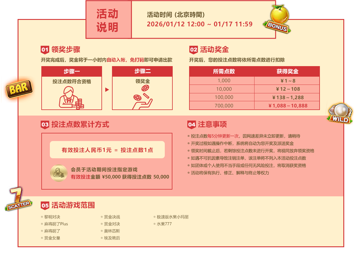 - 活动期间:2026/01/12 12:00 - 01/17 11:59 (北京时间),累计投注点数及领奖时间。